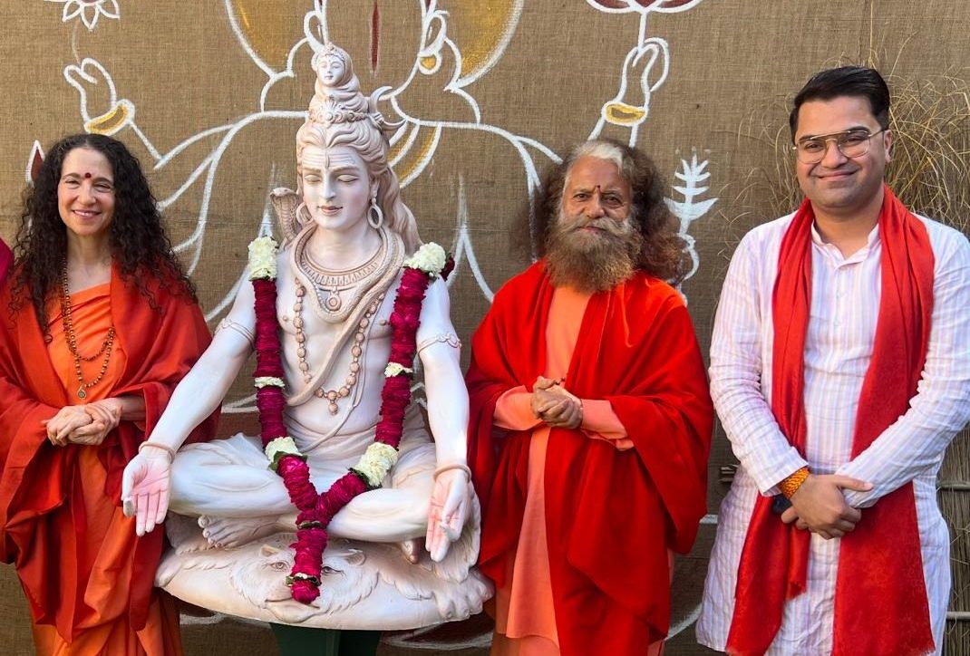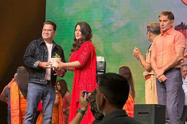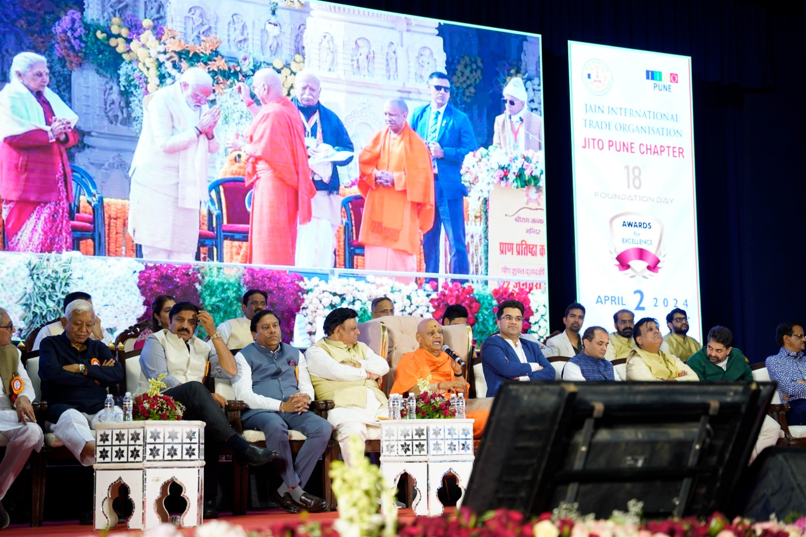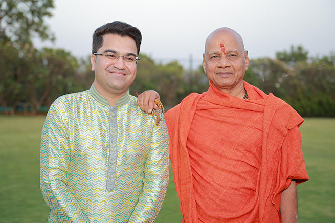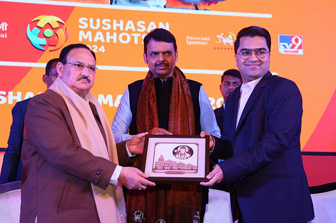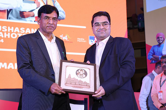 Abhay Bhutada, Swami Govind Dev Giri Maharaj, and Acharya Devvrat honouring H.B.P. Shri Maruti Baba Kurhekar with Sant Dnyaneshwar Award