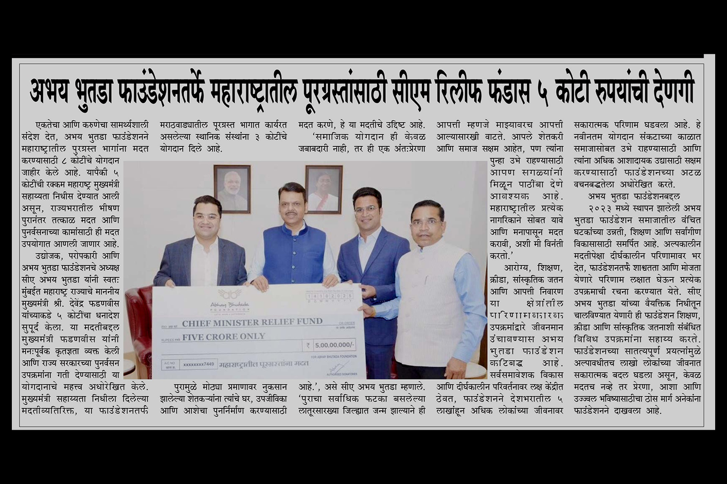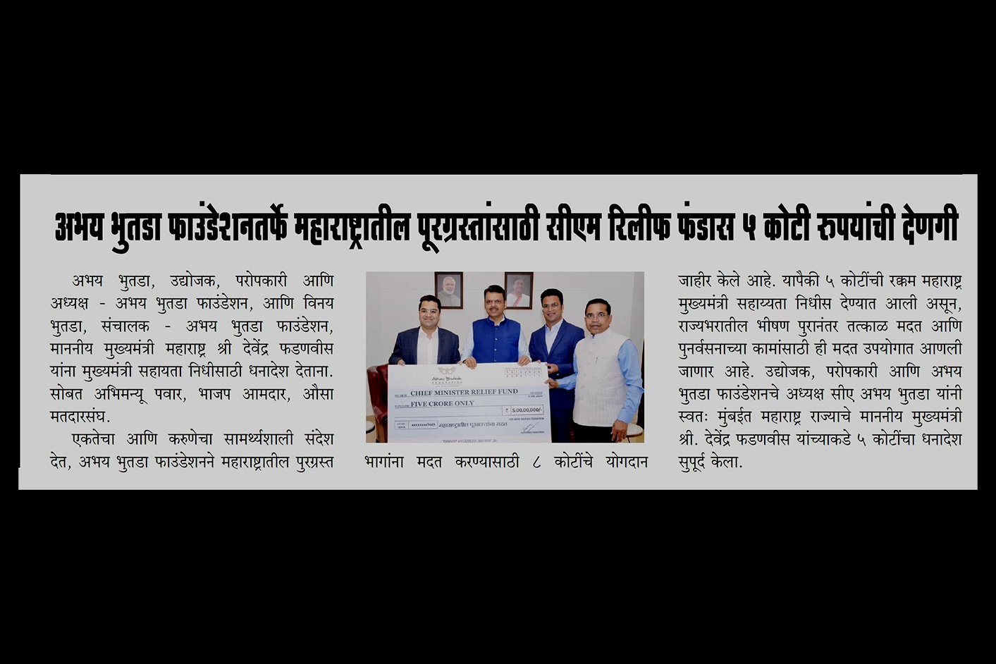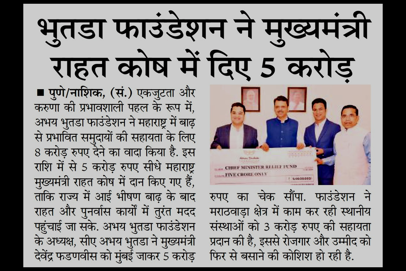 अभय भुटाडा फाउंडेशन ने महाराष्ट्र बाढ़ पीड़ितों के लिए मुख्यमंत्री राहत कोष में 5 करोड़ रुपये दान किए