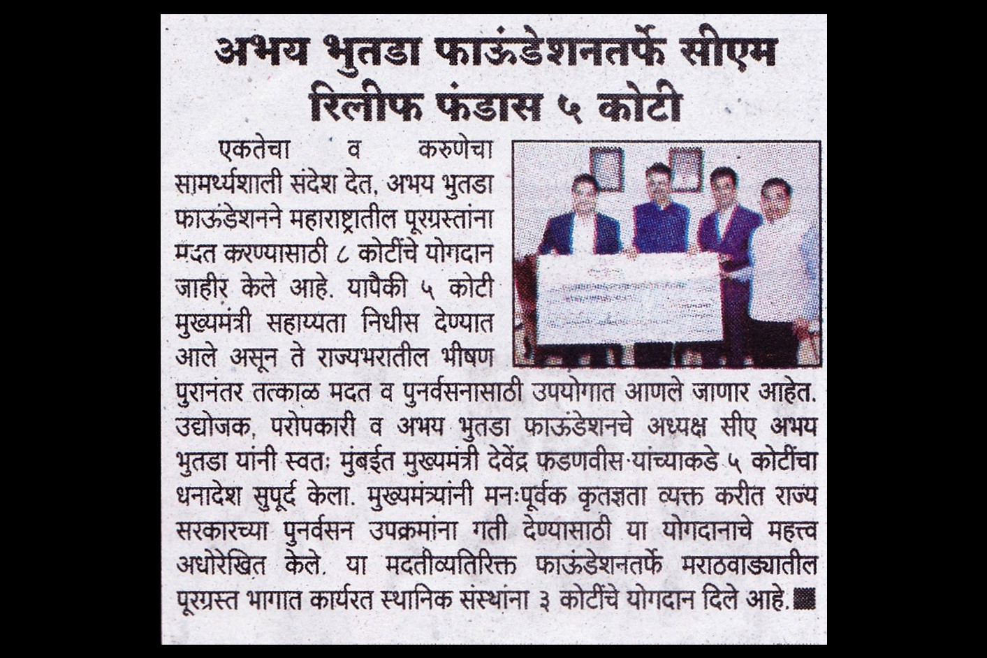 अभय भुतडा फाउंडेशनकडून महाराष्ट्रातील पूरग्रस्तांसाठी सीएम रिलीफ फंडास 5 कोटी